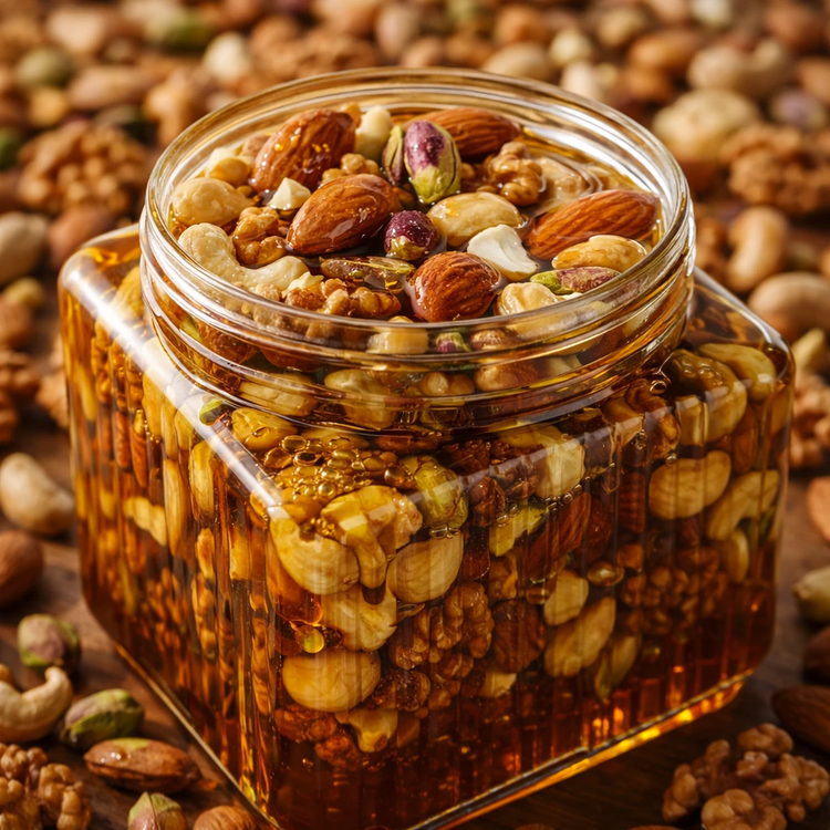 پایهی این معجون، عسل کنار طبیعی و خام است؛ عسلی با طبع گرم، عطر گیاهی عمیق و قدرت جذب بالا که بستر ایدهآلی برای انتقال مواد مغذی مغزها به بدن فراهم میکند. مغزها بهصورت درشت، تازه و بدون حرارتدهی در عسل خوابانده شدهاند تا خواص طبیعی آنها کاملاً حفظ شود.